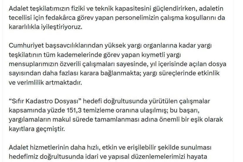 Bakan Gürlek, sanal medya hesabından yaptığı açıklamada, "Adalet teşkilatımızın fiziki ve teknik kapasitesini güçlendirirken, adaletin tecellisi için fedakarca görev yapan personelimizin çalışma koşullarını da kararlılıkla iyileştiriyoruz. Cumhuriyet başsavcılıklarından yüksek yargı organlarına kadar yargı teşkilatının tüm kademelerinde görev yapan kıymetli yargı mensuplarımızın özverili çalışmaları sayesinde, yıl içerisinde açılan dosya sayısından daha fazlası karara bağlanmakta; yargı süreçlerinde etkinlik ve verimlilik artmaktadır. 'Sıfır Kadastro Dosyası' hedefi doğrultusunda yürütülen çalışmalar kapsamında yüzde 151,3 temizleme oranına ulaşılmış; bu başarı, yargılamaların makul sürede tamamlanması adına önemli bir eşik olarak kayıtlara geçmiştir" dedi.