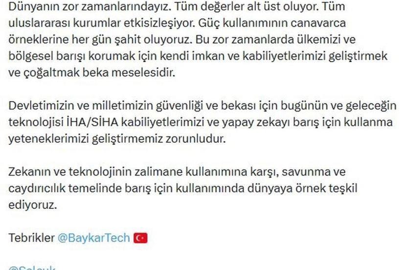 Ak Parti Genel Başkan Yardımcısı ve Parti Sözcüsü Ömer Çelik, "Devletimizin ve milletimizin güvenliği ve bekası için bugünün ve geleceğin teknolojisi İHA/ Siha kabiliyetlerimizi ve yapay zekayı barış için kullanma yeteneklerimizi geliştirmemiz zorunludur. Zekanın ve teknolojinin zalimane kullanımına karşı, savunma ve caydırıcılık temelinde barış için kullanımında dünyaya örnek teşkil ediyoruz" dedi.