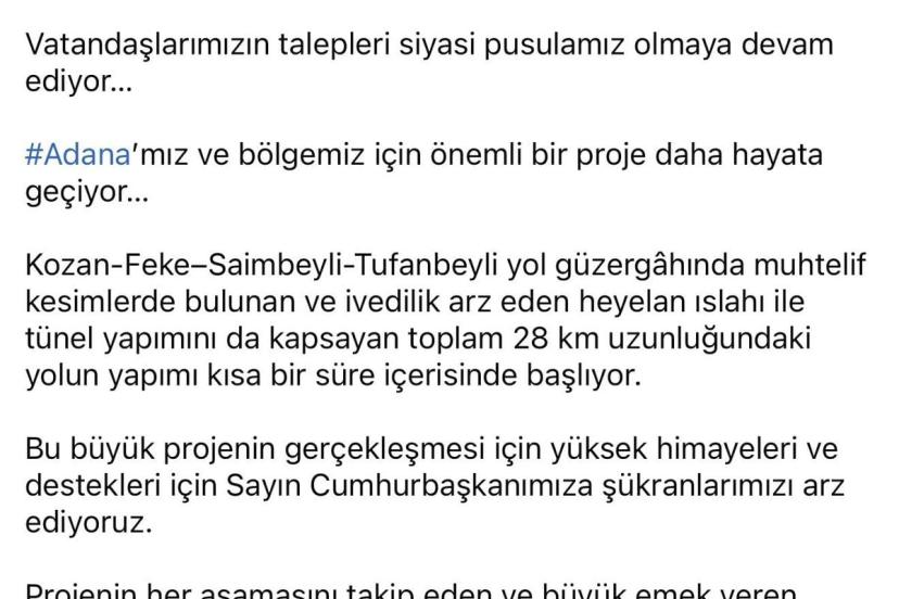 Konuyla ilgili AK Parti Genel Başkan Yardımcısı ve Parti Sözcüsü Ömer Çelik, sosyal medya hesabından açıklamalarda bulundu. Çelik, "Vatandaşlarımızın talepleri siyasi pusulamız olmaya devam ediyor. Adana'mız ve bölgemiz için önemli bir proje daha hayata geçiyor. Kozan-Feke-Saimbeyli-Tufanbeyli yol güzergahında muhtelif kesimlerde bulunan ve ivedilik arz eden heyelan ıslahı ile tünel yapımını da kapsayan toplam 28 kilometre uzunluğundaki yolun yapımı kısa bir süre içerisinde başlıyor. Bu büyük projenin gerçekleşmesi için yüksek himayeleri ve destekleri için Cumhurbaşkanımıza şükranlarımızı arz ediyoruz. Projenin her aşamasını takip eden ve büyük emek veren Ulaştırma ve Altyapı Bakanımız Abdulkadir Uraloğlu'na teşekkür ediyoruz" ifadelerini kullandı. - ADANA