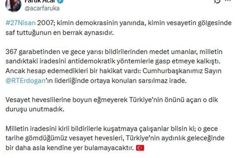 AK Parti'li Acar, sanal medya hesabından yaptığı açıklamada, "27 Nisan 2007; kimin demokrasinin yanında, kimin vesayetin gölgesinde saf tuttuğunun en berrak aynasıdır. 367 garabetinden ve gece yarısı bildirilerinden medet umanlar, milletin sandıktaki iradesini antidemokratik yöntemlerle gasp etmeye kalkıştı. Ancak hesap edemedikleri bir hakikat vardı. Cumhurbaşkanımız Sayın Recep Tayyip Erdoğan'ın liderliğinde ortaya konulan sarsılmaz irade. Vesayet heveslilerine boyun eğmeyerek Türkiye'nin önünü açan o dik duruşu unutmadık. Milletin iradesini kirli bildirilerle kuşatmaya çalışanlar bilsin ki o gece tarihe gömdüğümüz vesayet hevesleri, Türkiye'nin aydınlık geleceğinde bir daha asla kendine yer bulamayacaktır" ifadelerini kullandı.