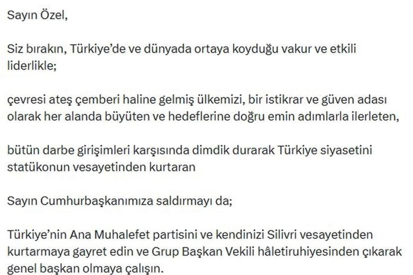 Efkan Ala, sanal medya hesabından yaptığı açıklamada, "Sayın Özel, siz bırakın, Türkiye'de ve dünyada ortaya koyduğu vakur ve etkili liderlikle; çevresi ateş çemberi haline gelmiş ülkemizi, bir istikrar ve güven adası olarak her alanda büyüten ve hedeflerine doğru emin adımlarla ilerleten, bütün darbe girişimleri karşısında dimdik durarak Türkiye siyasetini statükonun vesayetinden kurtaran Sayın Cumhurbaşkanımıza saldırmayı da; Türkiye'nin ana muhalefet partisini ve kendinizi Silivri vesayetinden kurtarmaya gayret edin ve grup başkan vekili haletiruhiyesinden çıkarak genel başkan olmaya çalışın. Böylece ülkemize de partinize de katkıda bulunmuş olursunuz" dedi.