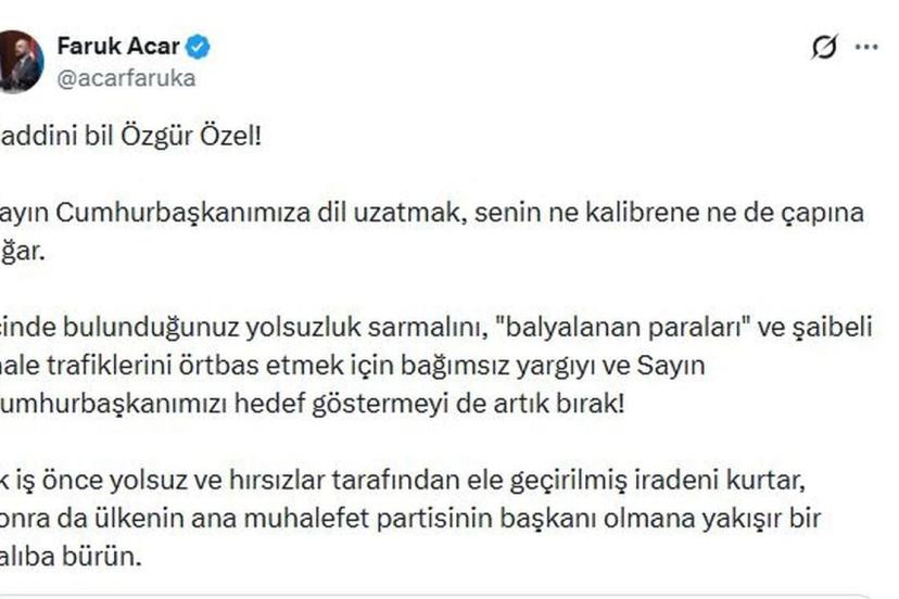 AK Parti Genel Başkan Yardımcısı Faruk Acar, sanal medya üzerinden yaptığı paylaşımda, "Haddini bil Özgür Özel. Sayın Cumhurbaşkanımıza dil uzatmak, senin ne kalibrene ne de çapına sığar. İçinde bulunduğunuz yolsuzluk sarmalını, 'Balyalanan paraları' ve şaibeli ihale trafiklerini örtbas etmek için bağımsız yargıyı ve Sayın Cumhurbaşkanımızı hedef göstermeyi de artık bırak. İlk iş önce yolsuz ve hırsızlar tarafından ele geçirilmiş iradeni kurtar, sonra da ülkenin ana muhalefet partisinin başkanı olmana yakışır bir kalıba bürün" ifadelerini kullandı.