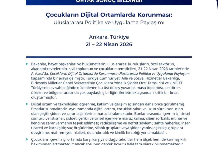 Aile ve Sosyal Hizmetler Bakanlığı ev sahipliğinde Birleşmiş Milletler Çocuk Fonu (UNICEF) ve Birleşmiş Milletler (BM) Genel Sekreteri Çocuklara Yönelik Şiddet Özel Temsilciliği iş birliğiyle 'Çocukların Dijital Ortamlarda Korunmasına İlişkin Uluslararası Politika ve Uygulama Paylaşımı' programı 21-22 Nisan'da gerçekleştirildi.