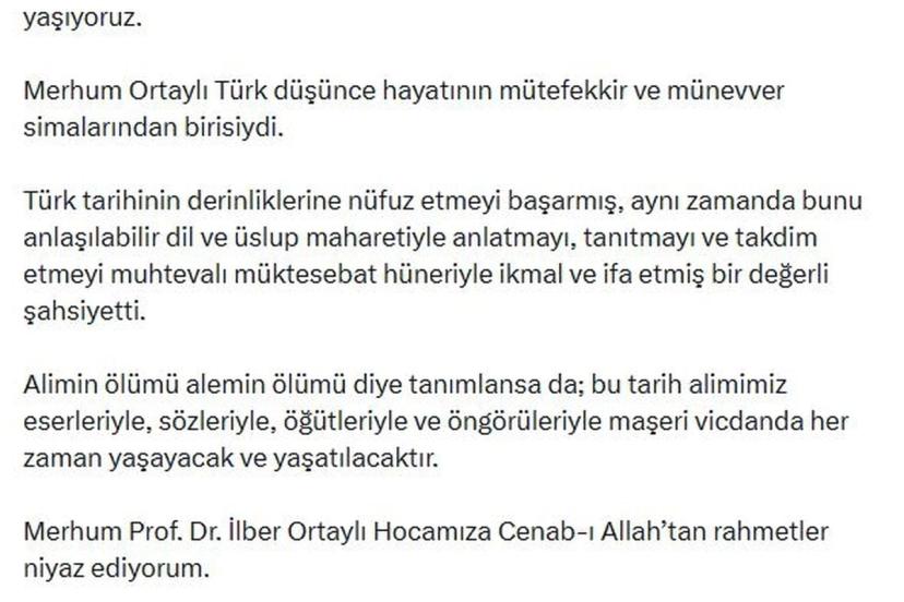 Bahçeli, sanal medya hesabından paylaştığı mesajda, "Türk milletinin yetiştirdiği muhterem ve müstesna ilim insanı, kalemiyle ve kelamıyla tarih şuurunun oluşmasında ve olgunlaşmasında muazzam hizmetleri bulunan Prof. Dr. İlber Ortaylı Hocamızı kaybetmenin hüznünü yaşıyoruz. Merhum Ortaylı, Türk düşünce hayatının mütefekkir ve münevver simalarından birisiydi. Türk tarihinin derinliklerine nüfuz etmeyi başarmış, aynı zamanda bunu anlaşılabilir dil ve üslup maharetiyle anlatmayı, tanıtmayı ve takdim etmeyi muhtevalı müktesebat hüneriyle ikmal ve ifa etmiş bir değerli şahsiyetti. Alimin ölümü alemin ölümü diye tanımlansa da; bu tarih alimimiz eserleriyle, sözleriyle, öğütleriyle ve öngörüleriyle maşeri vicdanda her zaman yaşayacak ve yaşatılacaktır. Merhum Prof. Dr. İlber Ortaylı Hocamıza Cenab-ı Allah'tan rahmetler niyaz ediyorum. Kederli ailesine, Türk akademik hayatına, elbette aziz milletimize sabır ve başsağlığı diliyorum. 'Mekanı cennet, ruhu şad olsun' diyorum" dedi.