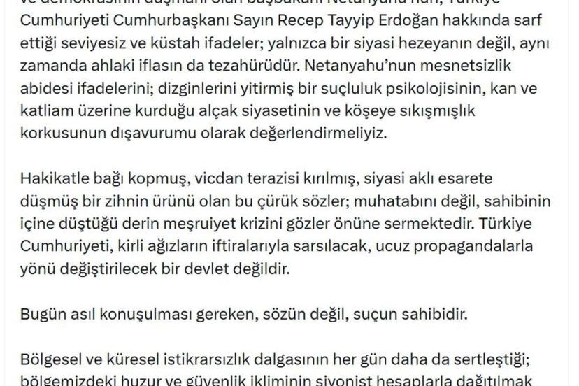 "Bölgesel ve küresel istikrarsızlık dalgasının her gün daha da sertleştiği; bölgemizdeki huzur ve güvenlik ikliminin siyonist hesaplarla dağıtılmak istendiği, emperyalizmin bu kanlı ve kirli oyuna çanak tuttuğu günümüzde; masum sivilleri hunharca katleden bir terör makinesinin Sayın Cumhurbaşkanımıza, ülkemize, devletimize söz söylemeye kalkışması, utanmazlığın ve küstahlığın ulaştığı yeni bir dip noktadır. Gazze'de çocukların üzerine yağan bombaların hesabını veremeyenler; Batı Şeria'yı gasbeden, Lübnan'ı işgal eden, Suriye'nin egemenliğini tehdit eden ve İran'da gayrimeşru yollarla rejim mühendisliğine soyunan, çevre ülkelerin iç dengelerini bozmayı alışkanlık haline getiren bu anlayış; bölgeyi ateş çemberine çeviren saldırgan politikalarıyla insanlık vicdanında mahkum olmuştur ve şimdi dikkatleri başka yöne çekmek için gürültü çıkarmaktadır. Barışı çalan, güvenliği talan eden, insanlığın ortak değerlerini yağmalayan bu yaklaşım; sadece bir saldırganlık değil, aynı zamanda bir kleptokrasi ve ahlaki çöküştür."
