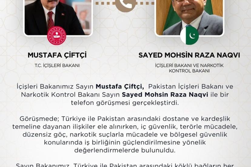 Bakanlığın sanal medya hesabından yapılan açıklamada, "İçişleri Bakanımız Mustafa Çiftçi, Pakistan İçişleri Bakanı ve Narkotik Kontrol Bakanı Sayın Sayed Mohsin Raza Naqvi ile bir telefon görüşmesi gerçekleştirdi. Görüşmede; Türkiye ile Pakistan arasındaki dostane ve kardeşlik temeline dayanan ilişkiler ele alınırken, iç güvenlik, terörle mücadele, düzensiz göç, narkotik suçlarla mücadele ve bölgesel güvenlik konularında iş birliğinin güçlendirilmesine yönelik değerlendirmelerde bulunuldu. Sayın Bakanımız, Türkiye ile Pakistan arasındaki köklü bağların her alanda daha da ileri taşınmasına büyük önem verdiklerini ifade etti. Türkiye ile Pakistan arasındaki iş birliği, önümüzdeki dönemde de karşılıklı anlayış ve yakın diyalog temelinde sürdürülecektir" denildi.
