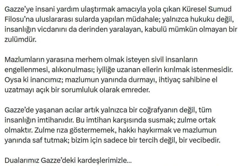 İçişleri Bakanı Mustafa Çiftçi, sanal medya hesabından yaptığı açıklamada, "Gazze'ye insani yardım ulaştırmak amacıyla yola çıkan Küresel Sumud Filosu'na uluslararası sularda yapılan müdahale; yalnızca hukuku değil, insanlığın vicdanını da derinden yaralayan, kabulü mümkün olmayan bir zulümdür. Mazlumların yarasına merhem olmak isteyen sivil insanların engellenmesi, alıkonulması; iyiliğe uzanan ellerin kırılmak istenmesidir. Oysa ki inancımız; mazlumun yanında durmayı, ihtiyaç sahibine el uzatmayı açık bir sorumluluk olarak emreder. Gazze'de yaşanan acılar artık yalnızca bir coğrafyanın değil, tüm insanlığın imtihanıdır. Bu imtihan karşısında susmak; zulme ortak olmaktır. Zulme rıza göstermemek, hakkı haykırmak ve mazlumun yanında saf tutmak; bizim için sadece bir tercih değil, bir vecibedir. Dualarımız Gazze'deki kardeşlerimizle. Rabb'im, mazlumların yardımcısı olsun; adaleti, merhameti ve hakkı yeryüzünde hakim kılsın" dedi.