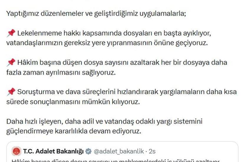 Adalet Bakanı Akın Gürlek, yargının iyileştirilmesi kapsamında yapılan çalışmalara ilişkin sanal medya hesabından açıklama yaptı. Bakan Gürlek, "Vatandaşlarımızın adalet hizmetlerine daha hızlı ve etkin erişimi için çalışmalarımızı kararlılıkla sürdürüyoruz. Yaptığımız düzenlemeler ve geliştirdiğimiz uygulamalarla; lekelenmeme hakkı kapsamında dosyaları en başta ayıklıyor, vatandaşlarımızın gereksiz yere yıpranmasının önüne geçiyoruz. Hakim başına düşen dosya sayısını azaltarak her bir dosyaya daha fazla zaman ayrılmasını sağlıyoruz. Soruşturma ve dava süreçlerini hızlandırarak yargılamaların daha kısa sürede sonuçlanmasını mümkün kılıyoruz. Daha hızlı işleyen, daha adil ve vatandaş odaklı yargı sistemini güçlendirmeye kararlılıkla devam ediyoruz" dedi.
