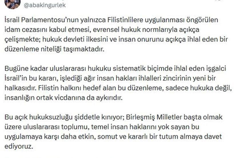 ADALET Bakanı Akın Gürlek, "İsrail parlamentosunun yalnızca Filistinlilere uygulanması öngörülen idam cezasını kabul etmesi, evrensel hukuk normlarıyla açıkça çelişmekte; hukuk devleti ilkesini ve insan onurunu açıkça ihlal eden bir düzenleme niteliği taşımaktadır" dedi.