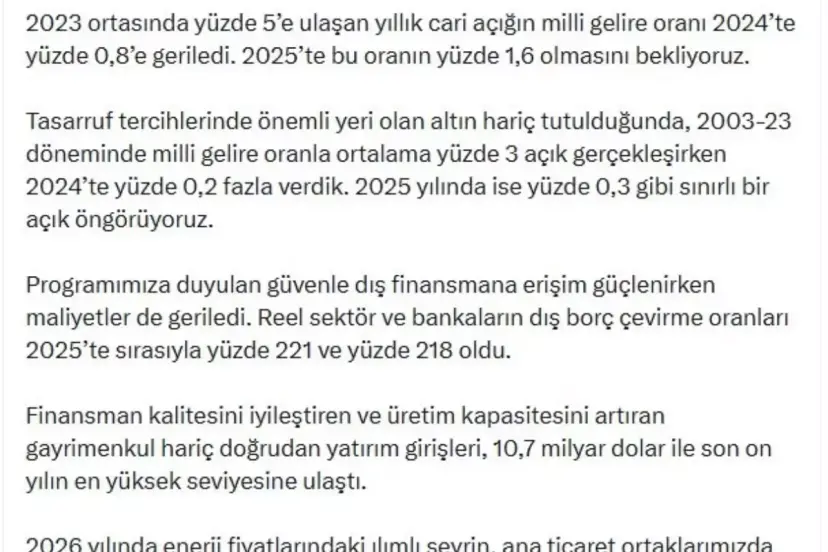 Hazine ve Maliye Bakanı Mehmet Şimşek, ödemeler dengesi istatistiklerine ilişkin sanal medya hesabından açıklama yaptı. Bakan Şimşek, "Zorlu küresel koşullara rağmen cari dengede sürdürülebilir seviyeler korunuyor. 2023 ortasında yüzde 5'e ulaşan yıllık cari açığın milli gelire oranı 2024'te yüzde 0,8'e geriledi. 2025'te bu oranın yüzde 1,6 olmasını bekliyoruz. Tasarruf tercihlerinde önemli yeri olan altın hariç tutulduğunda, 2003-23 döneminde milli gelire oranla ortalama yüzde 3 açık gerçekleşirken 2024'te yüzde 0,2 fazla verdik. 2025 yılında ise yüzde 0,3 gibi sınırlı bir açık öngörüyoruz. Programımıza duyulan güvenle dış finansmana erişim güçlenirken maliyetler de geriledi. Reel sektör ve bankaların dış borç çevirme oranları 2025'te sırasıyla yüzde 221 ve yüzde 218 oldu. Finansman kalitesini iyileştiren ve üretim kapasitesini artıran gayrimenkul hariç doğrudan yatırım girişleri, 10,7 milyar dolar ile son on yılın en yüksek seviyesine ulaştı. 2026 yılında enerji fiyatlarındaki ılımlı seyrin, ana ticaret ortaklarımızda iyileşen görünümün ve destekleyici avro/dolar paritesinin sürdürülebilir cari denge hedefimize olumlu katkı vermesini öngörüyoruz. Cari dengedeki kazanımlarımızı kalıcı hale getirecek yapısal adımları hayata geçirmeye devam ediyoruz" dedi.