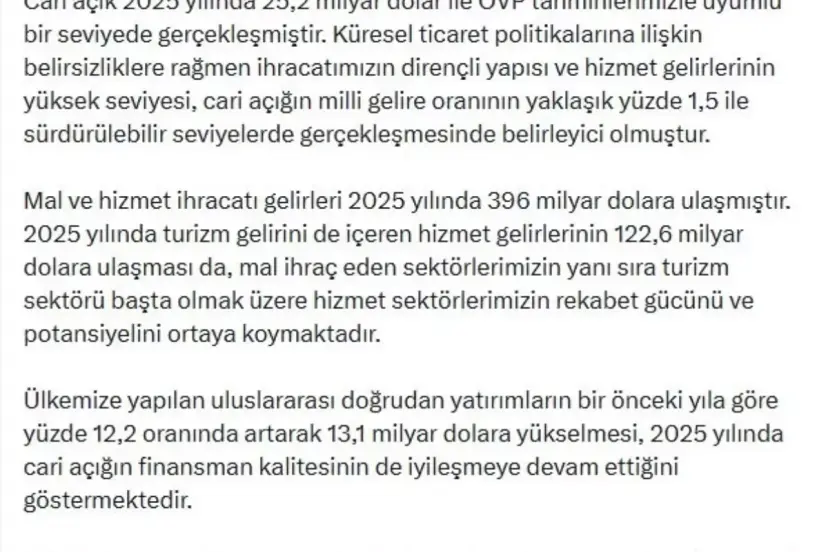 Cumhurbaşkanı Yardımcısı Cevdet Yılmaz, 2025'te cari açığın 25,2 milyar dolar ile Orta Vadeli Program tahminleriyle uyumlu olduğunu açıkladı. Sürdürülebilir seviye ve artan hizmet gelirleri, cari açığın milli gelire oranını olumlu etkiledi.