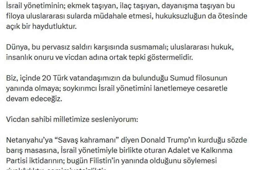 CHP Genel Başkanı Özgür Özel, "Gazze'ye yardım ulaştırmak için yola çıkan Küresel Sumud filosu, insanlığın ortak vicdanını temsil etmektedir. İsrail yönetiminin; ekmek taşıyan, ilaç taşıyan, dayanışma taşıyan bu filoya uluslararası sularda müdahale etmesi, hukuksuzluğun da ötesinde açık bir haydutluktur" dedi.