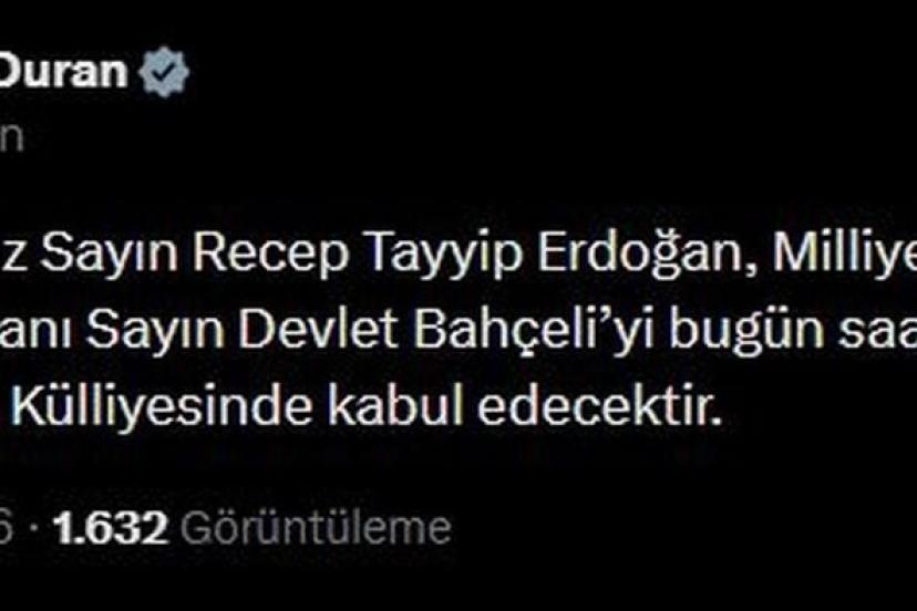 İletişim Başkanı Burhanettin Duran, sanal medya hesabından yaptığı açıklamada, "Cumhurbaşkanımız Sayın Recep Tayyip Erdoğan, Milliyetçi Hareket Partisi (MHP) Genel Başkanı Sayın Devlet Bahçeli'yi bugün saat 17.30'da Cumhurbaşkanlığı Külliyesinde kabul edecektir" dedi.
