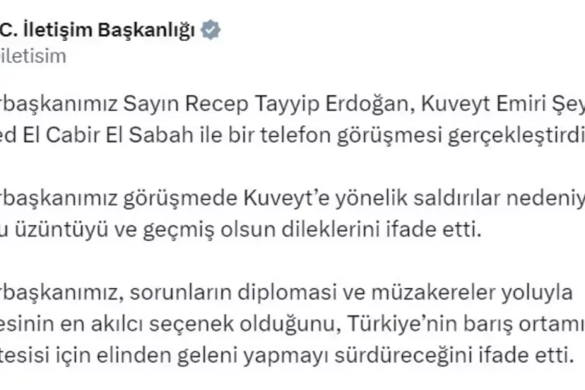 İletişim Başkanlığı'nın sanal medya hesabından yapılan açıklamada, "Cumhurbaşkanımız Sayın Recep Tayyip Erdoğan, Kuveyt Emiri Şeyh Mişal El Ahmed El Cabir El Sabah ile bir telefon görüşmesi gerçekleştirdi. Cumhurbaşkanımız görüşmede Kuveyt'e yönelik saldırılar nedeniyle duyduğu üzüntüyü ve geçmiş olsun dileklerini ifade etti. Cumhurbaşkanımız, sorunların diplomasi ve müzakereler yoluyla çözülmesinin en akılcı seçenek olduğunu, Türkiye'nin barış ortamının süratle tesisi için elinden geleni yapmayı sürdüreceğini ifade etti" denildi.