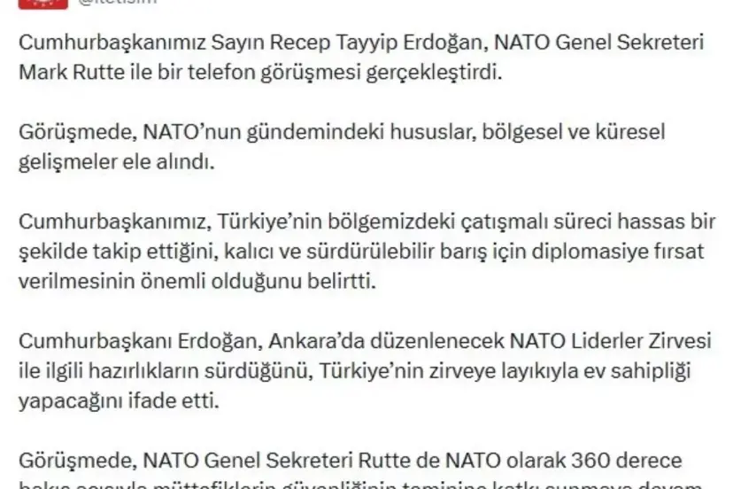İletişim Başkanlığı'ndan yapılan açıklamada, "Cumhurbaşkanımız Sayın Recep Tayyip Erdoğan, NATO Genel Sekreteri Mark Rutte ile bir telefon görüşmesi gerçekleştirdi. Görüşmede, NATO'nun gündemindeki hususlar, bölgesel ve küresel gelişmeler ele alındı. Cumhurbaşkanımız, Türkiye'nin bölgemizdeki çatışmalı süreci hassas bir şekilde takip ettiğini, kalıcı ve sürdürülebilir barış için diplomasiye fırsat verilmesinin önemli olduğunu belirtti. Cumhurbaşkanı Erdoğan, Ankara'da düzenlenecek NATO Liderler Zirvesi ile ilgili hazırlıkların sürdüğünü, Türkiye'nin zirveye layıkıyla ev sahipliği yapacağını ifade etti. Görüşmede, NATO Genel Sekreteri Rutte de NATO olarak 360 derece bakış açısıyla müttefiklerin güvenliğinin teminine katkı sunmaya devam edeceklerini belirtti" denildi.