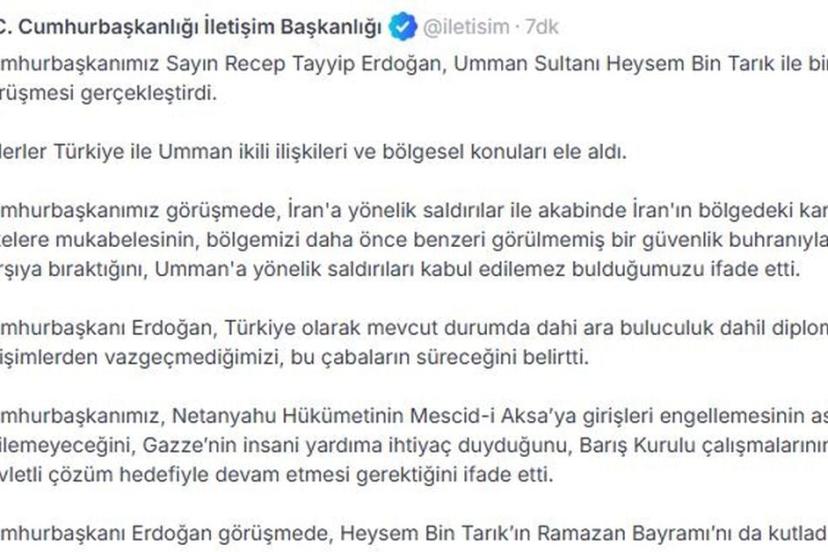 İletişim Başkanlığı'ndan yapılan açıklamada, "Cumhurbaşkanımız Sayın Recep Tayyip Erdoğan, Umman Sultanı Heysem Bin Tarık ile bir telefon görüşmesi gerçekleştirdi. Liderler Türkiye ile Umman ikili ilişkileri ve bölgesel konuları ele aldı. Cumhurbaşkanımız görüşmede, İran'a yönelik saldırılar ile akabinde İran'ın bölgedeki kardeş ülkelere mukabelesinin, bölgemizi daha önce benzeri görülmemiş bir güvenlik buhranıyla karşı karşıya bıraktığını, Umman'a yönelik saldırıları kabul edilemez bulduğumuzu ifade etti. Cumhurbaşkanı Erdoğan, Türkiye olarak mevcut durumda dahi ara buluculuk dahil diplomatik girişimlerden vazgeçmediğimizi, bu çabaların süreceğini belirtti. Cumhurbaşkanımız, Netanyahu Hükümetinin Mescid-i Aksa'ya girişleri engellemesinin asla kabul edilemeyeceğini, Gazze'nin insani yardıma ihtiyaç duyduğunu, Barış Kurulu çalışmalarının da iki devletli çözüm hedefiyle devam etmesi gerektiğini ifade etti. Cumhurbaşkanı Erdoğan görüşmede, Heysem Bin Tarık'ın Ramazan Bayramı'nı da kutladı" denildi.