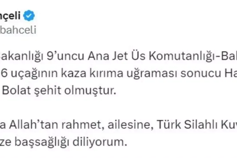 MHP Genel Başkanı Devlet Bahçeli, Balıkesir'den kalkış yapan F-16 uçağının kaza kırıma uğraması sonucu şehit olan Hava Pilot Binbaşı İbrahim Bolat için taziye mesajı yayımladı.