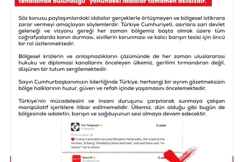"Bazı medya organları ve sosyal medya paylaşımlarında Cumhurbaşkanımıza atfen yer alan, ' Türkiye'nin İsrail'e yönelik işgal tehdidinde bulunduğu' yönündeki iddialar tamamen asılsızdır. Söz konusu paylaşımlardaki iddialar gerçeklerle örtüşmeyen ve bölgesel istikrara zarar vermeyi amaçlayan söylemlerdir. Türkiye Cumhuriyeti, asırlara sari devlet geleneği ve vizyonu gereği her zaman bölgemiz başta olmak üzere tüm coğrafyalarda kanın durması, sivillerin korunması ve kalıcı barışın tesisi için öncü bir rol üstlenmektedir. Bölgesel krizlerin ve anlaşmazlıkların çözümünde de her zaman uluslararası hukuku ve diplomasi kanallarını önceleyen ülkemiz, gerilimi tırmandıran değil, düşüren bir tutum sergilemektedir. Sayın Cumhurbaşkanımızın liderliğinde Türkiye, herhangi bir ayrım gözetmeksizin bölge halklarının huzur, güven ve refah içinde yaşamasını öncelemektedir. Türkiye'nin mücadelesini ve insani duruşunu çarpıtarak sunmaya çalışan manipülatif içeriklere itibar edilmemelidir." - ANKARA