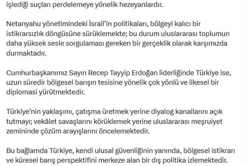 AK Parti Genel Başkanvekili Efkan Ala, "Netanyahu'nun Türkiye ve Sayın Cumhurbaşkanımız hakkında sarf ettiği sözler, kendi soykırımcı ve katliamcı politikalarını ve insanlığa karşı işlediği suçları perdelemeye yönelik hezeyanlardır" dedi.