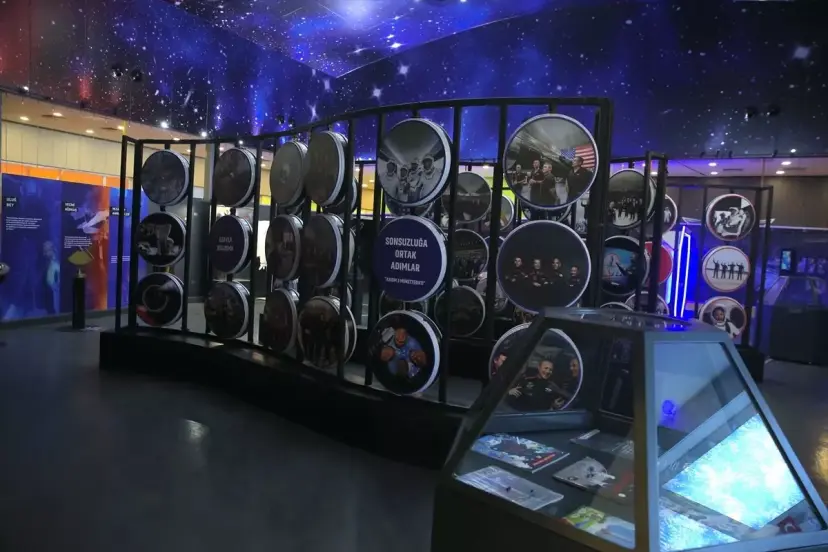 Ufkun Ötesinde Uzay Sergisi alanında, Türkiye'nin uzay teknolojilerindeki ilerleyişini anlatan görseller, sinevizyon gösterimleri ve etkileşimli öğrenme bölümleri yer alıyor.