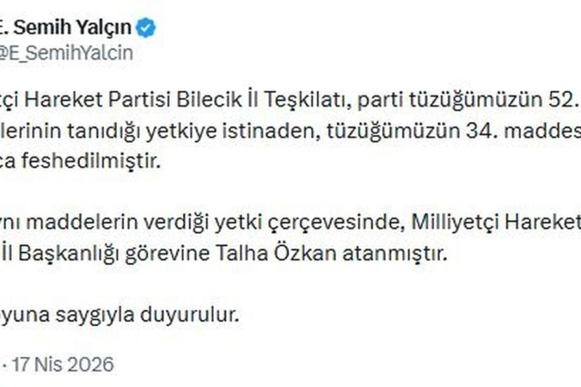 MHP'li Semih Yalçın, sanal medya hesabından yaptığı açıklamada, "Milliyetçi Hareket Partisi Bilecik İl Teşkilatı, parti tüzüğümüzün 52 ve 54'üncü maddelerinin tanıdığı yetkiye istinaden, tüzüğümüzün 34'üncü maddesi uyarınca feshedilmiştir. Yine aynı maddelerin verdiği yetki çerçevesinde, Milliyetçi Hareket Partisi Bilecik İl Başkanlığı görevine Talha Özkan atanmıştır" ifadelerini kullandı.