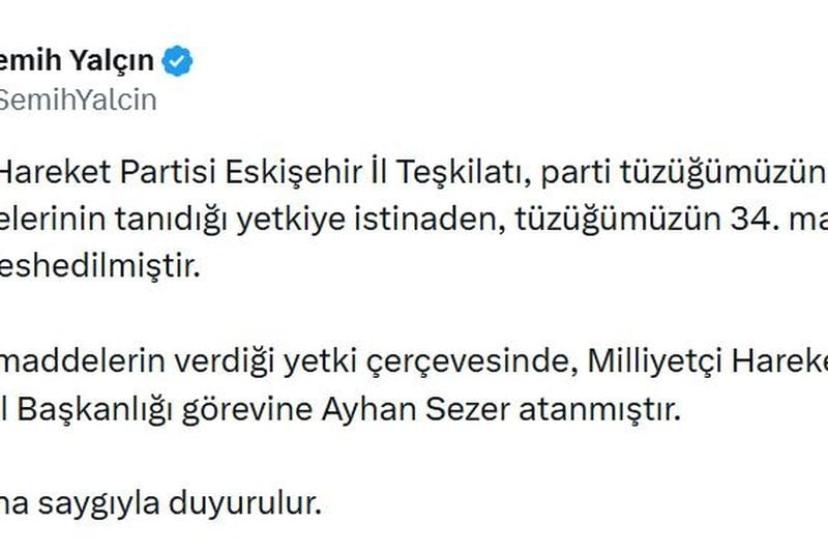 MHP'li Yalçın, sanal medya hesabından yaptığı açıklamada, "Milliyetçi Hareket Partisi Eskişehir İl Teşkilatı, parti tüzüğümüzün 52 ve 54'üncü maddelerinin tanıdığı yetkiye istinaden, tüzüğümüzün 34'üncü maddesi uyarınca feshedilmiştir. Yine aynı maddelerin verdiği yetki çerçevesinde, Milliyetçi Hareket Partisi Eskişehir İl Başkanlığı görevine Ayhan Sezer atanmıştır" dedi.
