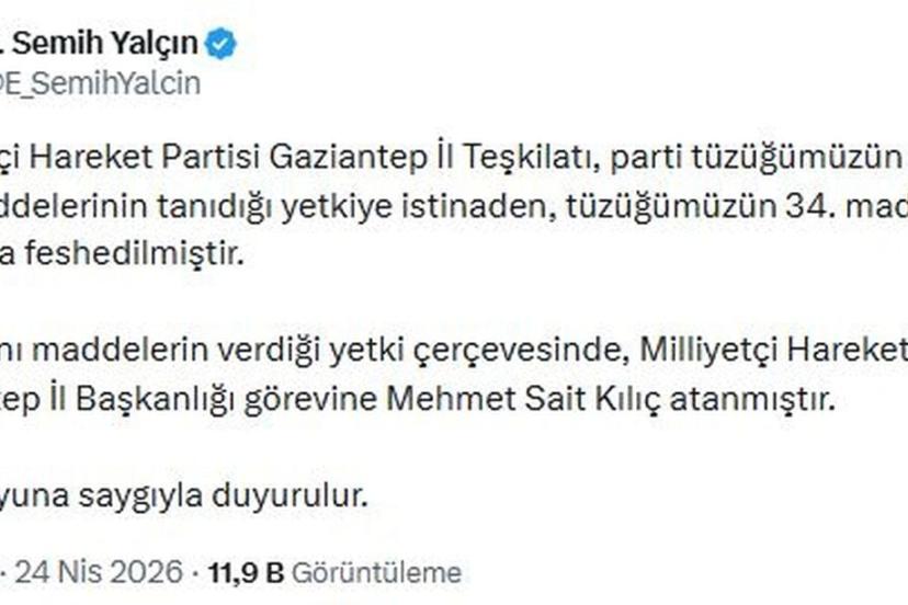 MHP'li Yalçın, sanal medya hesabından yaptığı açıklamada, "Milliyetçi Hareket Partisi Gaziantep İl Teşkilatı, parti tüzüğümüzün 52 ve 54'üncü maddelerinin tanıdığı yetkiye istinaden, tüzüğümüzün 34'üncü maddesi uyarınca feshedilmiştir. Yine aynı maddelerin verdiği yetki çerçevesinde, Milliyetçi Hareket Partisi Gaziantep İl Başkanlığı görevine Mehmet Sait Kılıç atanmıştır" ifadelerini kullandı.