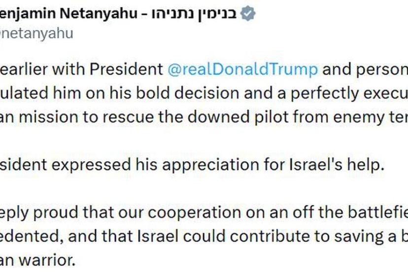 İsrail Başbakanı Binyamin Netanyahu, ABD Başkanı Donald Trump ile telefonda görüştüğünü belirterek, " İran'da düşen uçağın pilotunu düşman topraklarından kurtarma konusunda aldığı cesur karar ve kusursuz bir şekilde yürütülen Amerikan operasyonu nedeniyle kendisini şahsen tebrik ettim" açıklamasında bulundu.
