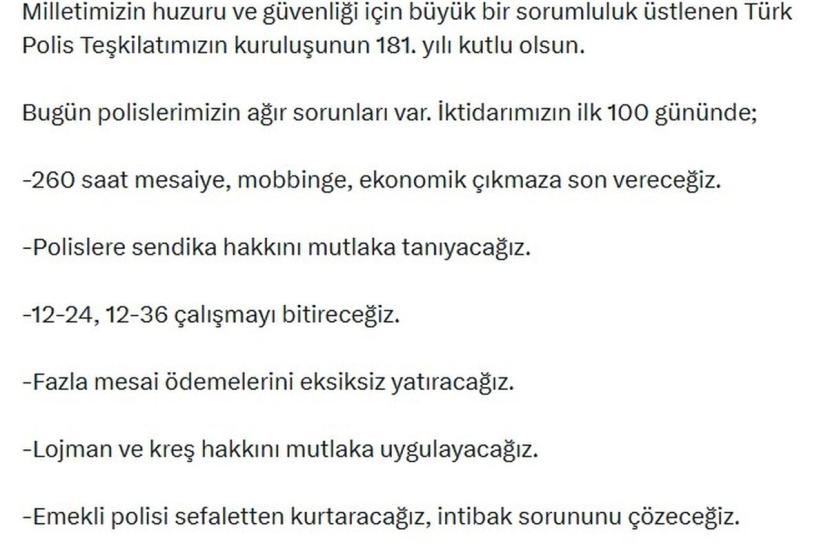 Özel, sanal medya hesabından yaptığı paylaşımda, "Milletimizin huzuru ve güvenliği için büyük bir sorumluluk üstlenen Türk Polis Teşkilatımızın kuruluşunun 181'inci yılı kutlu olsun. Bugün polislerimizin ağır sorunları var. İktidarımızın ilk 100 gününde; 260 saat mesaiye, mobbinge, ekonomik çıkmaza son vereceğiz. Polislere sendika hakkını mutlaka tanıyacağız. 12-24, 12-36 çalışmayı bitireceğiz. Fazla mesai ödemelerini eksiksiz yatıracağız. Lojman ve kreş hakkını mutlaka uygulayacağız. Emekli polisi sefaletten kurtaracağız, intibak sorununu çözeceğiz. Görevi başında olan tüm emniyet mensuplarımıza kolaylıklar diliyor, şehitlerimizi rahmet, gazilerimizi minnetle anıyorum" ifadelerini kullandı.