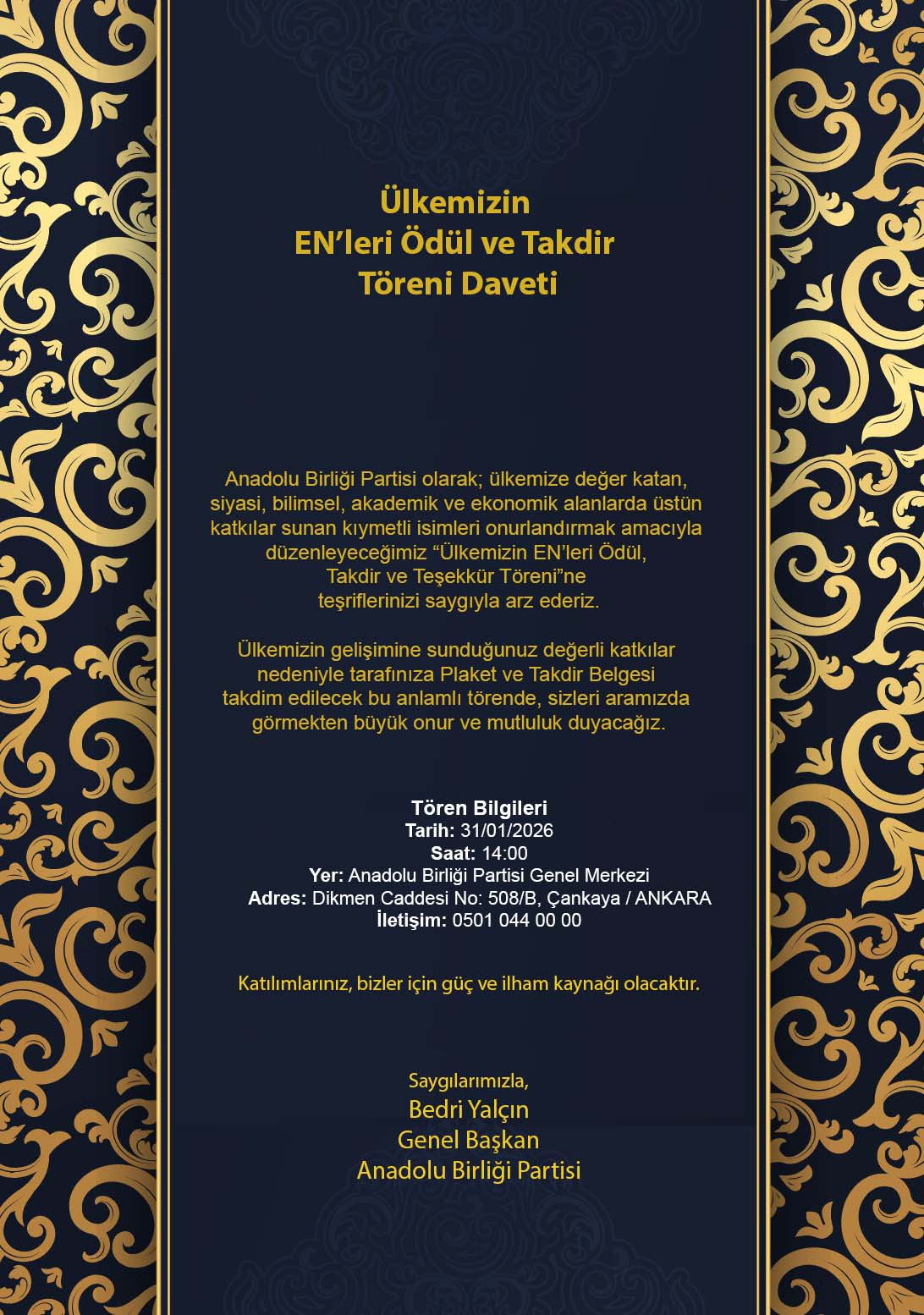 Anadolu Birliği Partisi (ABP), ülkeye katkı sunduğu değerlendirilen kişi ve kurumları bir araya getirmeyi hedefleyen yeni bir programı kamuoyuna duyurdu. Farklı alanlarda öne çıkan çalışmaların görünür olmasını amaçlayan organizasyonda, katılımcılara plaket ile takdir, başarı ve teşekkür belgeleri verilmesi planlanıyor. Programın, ABP Genel Başkanı Bedri Yalçın öncülüğünde hazırlandığı bildirildi.