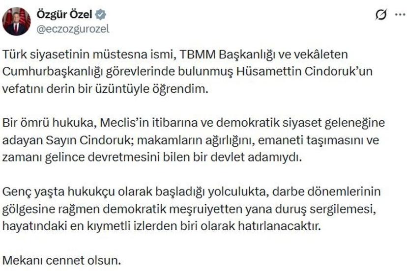 CHP Genel Başkanı Özgür Özel, sanal medya hesabından yaptığı açıklamada, "Türk siyasetinin müstesna ismi, TBMM Başkanlığı ve vekaleten Cumhurbaşkanlığı görevlerinde bulunmuş Hüsamettin Cindoruk'un vefatını derin bir üzüntüyle öğrendim. Bir ömrü hukuka, Meclis'in itibarına ve demokratik siyaset geleneğine adayan Sayın Cindoruk; makamların ağırlığını, emaneti taşımasını ve zamanı gelince devretmesini bilen bir devlet adamıydı. Genç yaşta hukukçu olarak başladığı yolculukta, darbe dönemlerinin gölgesine rağmen demokratik meşruiyetten yana duruş sergilemesi, hayatındaki en kıymetli izlerden biri olarak hatırlanacaktır. Mekanı cennet olsun" ifadelerini kullandı.