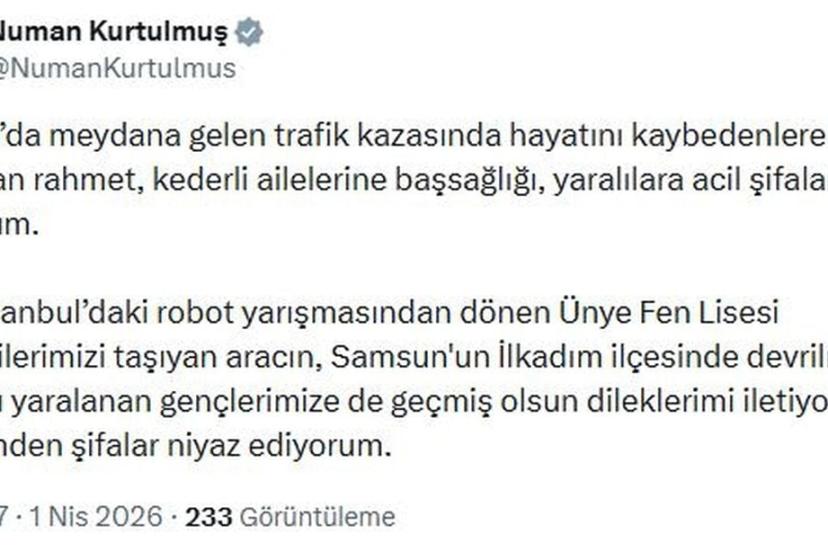 TBMM Başkanı Numan Kurtulmuş, Ankara'da meydana gelen trafik kazasında hayatını kaybedenler için sanal medya hesabından taziye mesajı yayımladı. Kurtulmuş, "Ankara'da meydana gelen trafik kazasında hayatını kaybedenlere Allah'tan rahmet, kederli ailelerine başsağlığı, yaralılara acil şifalar diliyorum. Dün İstanbul'daki robot yarışmasından dönen Ünye Fen Lisesi öğrencilerimizi taşıyan aracın, Samsun'un İlkadım ilçesinde devrilmesi sonucu yaralanan gençlerimize de geçmiş olsun dileklerimi iletiyor; Rabbimden şifalar niyaz ediyorum" ifadelerini kullandı.