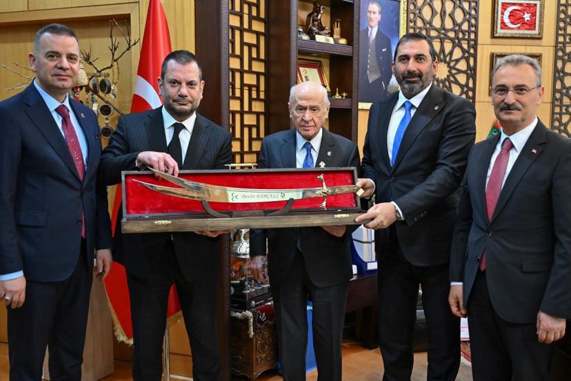 Ziyarette Bahçeli'ye, kulübün tarihindeki önemli dönüm noktalarından biri olan 1975-1976 sezonunu simgeleyen retro beyaz formanın yanı sıra işlemeli bir kılıç hediye edildi.