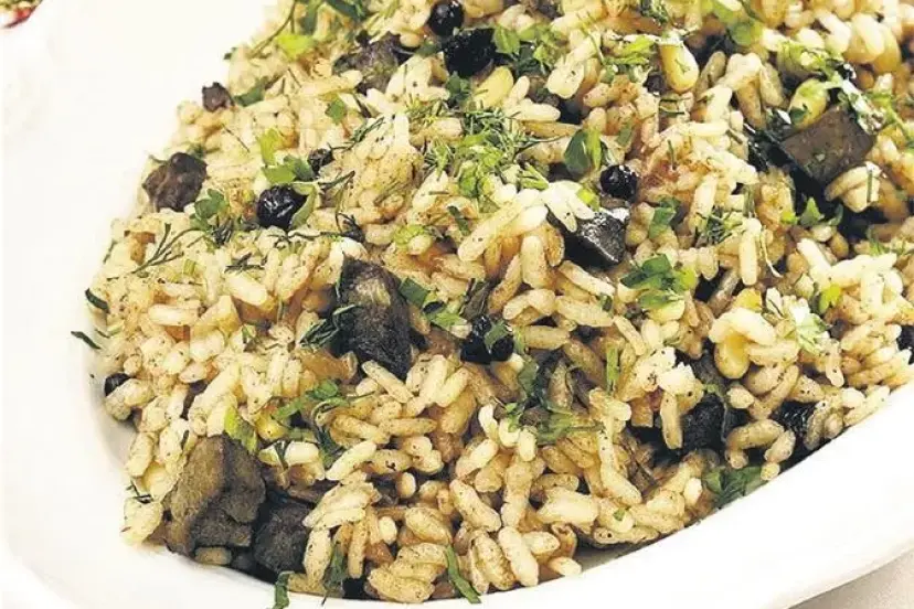 YAPILIŞI: Ciğerimizi tavla zarının 2 katı büyüklüğünde doğrayalım. Pirinci sıcak suda ıslatalım. Soğanı yemeklik küp doğrayalım. Zeytinyağının yarısını pilav tenceremize alalım. Soğanları ekleyerek yağımızı yakmadan pembeleşinceye kadar kavuralım. Dolma fıstığı da ekleyerek kavurmaya devam edelim. Rengi dönmeye yakın ciğerlerimizi ekleyelim. Tüm malzememizi, 3-4 dk. orta hararetteki ateşte kavuralım. Yıkayıp süzdüğümüz pirinci ekleyelim. Kavurmaya devam ettiğimiz pirince dolma baharı, karabiber ve tarçını ekleyelim. Kavurma işlemimiz bitince kuş üzümünü ilave edelim. Sıcak suyumuzu döküp, kalan zeytinyağı ve tuzu da en son ekleyelim. İç pilavımızı önce harlı ardından kısık ateşe alalım. Demlendirdikten sonra servis edelim.